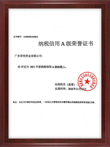 納稅信用A級(jí)榮譽(yù)證書(shū)